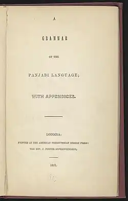 Title-page of 'A Grammar of the Panjabi Language; With Appendices' by the Ludhiana Mission (1851)A Grammar of the Panjabi Language; With Appendices (1851) by John Newton[5]