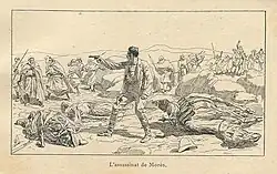 Morès returned to Algeria in March 1896.[17] He made a speaking tour of Algerian towns with Polignac in which he denounced the Jews. He said, "France is exploited to the profit on foreigners, above all, England with the connivance of the Jews.[18] Despite lack of money he decided to travel south the meet the Tuaregs, ignoring Polignac's warning that he should not go since he did not speak the language.[17] Morès set out south from Ghadames with five companions, and on 9 June 1896 was ambushed and killed by a Tuareg force.[19] Although Morès wanted the Tuareg to fight the Jews, his death was taken by the extreme right as evidence that the Tuareg were part of a huge conspiracy of Jews and Anglo-Saxons. The Dépêche algérien blamed the Polignacs and the Duveyriers for the tragedy and said the Tuaregs should be chased into their hideouts and made to pay for the bloodshed. Another Algerian newspaper said the Tuareg were like other "Semitic pirates, politicians and financiers" and should be outlawed.[20]