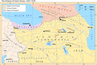 In 1457, Ludovico was in Georgia and Persia. It appears he undertook this journey on his own initiative after finding the way to Ethiopia and India difficult or impossible.[8] His explanation for his actions must have been convincing, since he was entrusted with further missions.[9] On 22 November 1457, Calixtus issued a letter of credence for Ludovico in the form of a bull addressed to Uzun Hasan, ruler of the Aq Qoyunlu. It was followed by a similar letter (but not bull) dated 1 December to Qvarqvare II, duke of Samtskhe. On 19 December, Calixtus addressed a bull to the Christians of Persia and Georgia, in which he mentions Ludovico's previous visit to them.[10] In the bull of 19 December and another dated 30 December, Calixtus charges Ludovico as papal nuncio with bringing the Christians of the southern Caucasus under a single authority and fomenting an anti-Ottoman alliance, if possible in conjunction with the Ethiopian emperor Zara Yaqob.[5]
