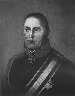 In the War of the Fourth Coalition (1806-7) against France, Stutterheim commanded the 21st Fusiliers, which was garrisoned in Heilsburg, East Prussia, part of modern-day Poland.[3] At the Battle of Heilsberg, his regiments formed the advanced guard for the Russo Prussian army.[4] For his insightful and brave conduct in the Battle of Eylau, he was promoted on 8 March 1807, to major general.[1] Subsequently, he participated at the Battle of Königsberg (1807) on 14 June 1807 in support for the 3rd Outpost Brigade commanded by Prince von Anhalt Schaumburg. There he had his Fusiliers Nr. 21, two infantry battalions, four squadrons of dragoons, and 1 horse artillery battery. Most of the third outpost brigade under the direct command of the Prince had become separated from the main force on the night of 12/13 June and came up behind the French line. They tried to break through to rejoin Stutterheim's support unit, but were overwhelmed and capitulated.[5] After the loss at Eylau and the subsequent Prussian military disintegration, he aligned himself with the army officers supporting a nationalist war.[6]