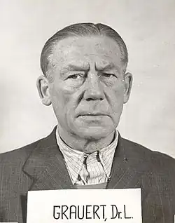 After leaving the civil service, Grauert returned to private industry in the energy sector, becoming a member of the Board of Directors of the Deutsche Continental Gasgesellschaft in Dessau. He also became the chairman of the board of trustees for General and Internal Administration of the Berlin Administrative Academy.[9] He also underwent military training in a Luftwaffe flak artillery unit and was the commander of an anti-aircraft regiment deployed in Denmark from November 1942 until August 1944, with the rank of Oberst of reserves.[10] Grauert appeared as a defense witness for the SS at the Nuremberg trials in 1946 and testified that any criminal actions committed during the early days of the regime were due to the chaotic state of the country at that time.[11] Few details are known of his subsequent life and he died in Cologne in June 1964.