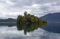 Its waters exhibit transparency to a depth of 11 metres (36 ft) and the lake itself has four prominent peninsulas and five islands. The five islands are: Heiwawu Island in the centre of the lake is inhabited by a variety of birds, Liwubi Island, Lige Island, Nixi Island (the smallest island, which is an oblong-shaped rock covered with shrubs and moss), and Lama Island. Three peninsulas and an island are linked to a seawall on the shore by a stone-paved path.[4][5][6][11][12]