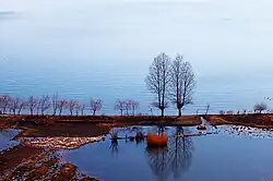The Gaizu River, flowing out of the lake at its southeast end, has a controlled outlet that is only operated during the rainy season and remains closed from September to May. Lugu Lake is snowbound for three months a year; in the autumn and spring, it has a cool and dry climate with warm daytime temperatures.[4][5][6]