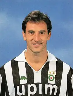 During his five-year stay with Juventus, as well as taking on his usual defensive role, he was also often employed as a box-to-box midfielder, due to his offensive and defensive work-rate and contribution.[2] Despite his defensive style of play, he was awarded the coveted number 10 shirt, following Michel Platini's retirement.[3] With the club, he won both the Coppa Italia and the UEFA Cup during the 1989–90 season. He scored for Juventus as they beat rivals Fiorentina in the 1990 UEFA Cup Final.[2] Despite being an accurate penalty taker,[2] he is also remembered for missing a penalty against Fiorentina the following season, after Roberto Baggio had refused to take a penalty against his former club.[4] With Juventus, he managed 28 goals in 217 appearances.[2]