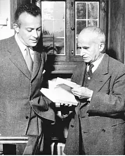 Einaudi was Governor of the Bank of Italy from 5 January 1945 until 11 May 1948, and was also a founding member of the Consulta Nazionale which opened the way to the new Parliament of the Italian Republic after World War II. Later he was Minister of Finances, Treasury and Balance, as well as Vice-Premier, in 1947–48. He was also a member of the neo-liberal think tank the Mont Pelerin Society.[7][8]