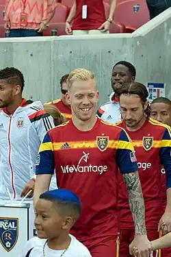 ![]() Mulholland lining up onto the field against DC United with Real Salt Lake in 2014. | |||