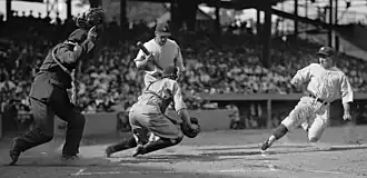 In 1933, Sewell was traded to the Washington Senators for catcher Roy Spencer.[13] Sewell posted career-highs with 125 hits and 30 doubles, as the Senators, under first-year player-manager Joe Cronin, won 99 games to clinch the American League pennant by nine games over the New York Yankees.[4][14] During an April game against the Yankees, Sewell made an odd double play. Lou Gehrig and Dixie Walker were on base when Tony Lazzeri hit a ball to deep right field. Gehrig hesitated as he waited to see if the ball would be caught, before heading towards home plate with Walker right behind him. Sewell caught right fielder Goose Goslin's throw and tagged both runners out with one sweeping motion.[15] Cronin credited Sewell as a major factor in helping the Senators' pitching staff.[16] The Senators lost to the New York Giants in the 1933 World Series.[17] In what would be his only postseason appearance as a player, Sewell posted a .176 batting average (3 for 17), with one stolen base, one run scored, and one RBI during the five-game series.[18]