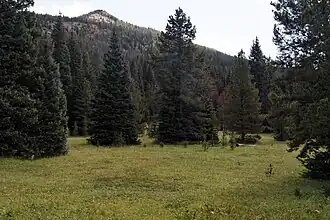 Lulu City was a transient mining town in eastern Grand County, Colorado, in the Kawuneeche Valley in what is now Rocky Mountain National Park. The town appeared after silver was discovered in the area in 1879 by prospector Joe Shipler,[2] and was built primarily by the Middle Park and Grand River Land Improvement Company in 1880. The company was backed by Benjamin F. Burnett of Fort Collins and Fort Collins rancher William Baker. The town was named after Burnett's daughter.[3][4] By 1881, there were forty cabins and a number of business establishments. By this time it was apparent that the silver ore was of low grade, and that high transportation costs made mining in the area marginal, and the town began its decline. It was abandoned by 1885,[5] except by Shipler, who lived there for thirty years.[2]