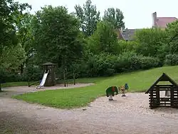 The Lunapark-Gesellschaft, incorporated in November 1912 and headed by Hugo Smidt, took a 15-year lease from Altona on two adjacent land parcels, including a flood retention basin, the Diebsteich; the projected opening date was 1 May 1913.[1] The original plan, by Ernst Schmidt & Liedtke, was Baroque in inspiration and highly symmetrical; after delays in construction and problems with building funds, the Altona town architect engaged the Danish architects Juul Brask and Elnar Rosenstand to simplify the park design and design the buildings.[1]