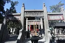Guanlin Tample:The Guanlin Temple in Luoyang is located at 2 Guanlin South Street. It is the burial place of the head of Guan Yu (his body is buried in Dangyang, Hubei).[6] Guanlin Temple was originally built during the Ming dynasty Wanli Emperor period and later expanded during the Qing dynasty Qianlong Emperor period. The existing buildings are mainly from the Ming Dynasty.[7]