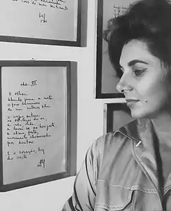 At the age of 30, with four published books and the fifth on its way, Lupe Cotrim took the exams to graduate in philosophy at the College of Philosophy, Sciences and Literature of the University of São Paulo (Faculdade de Filosofia, Ciências e Letras – FFCL/USP).[10] She entered the course in 1963 and graduated in 1966.[4] Cotrim sought in Philosophy conditions to reflect on language, rethink the effusion of the lyrical self in her writing, and better understand the world.[11] In this period, based on works by Carlos Drummond de Andrade, João Cabral de Melo Neto, and Francis Ponge, she discovered possibilities of a certain kind of "phenomenological poetry."[12]