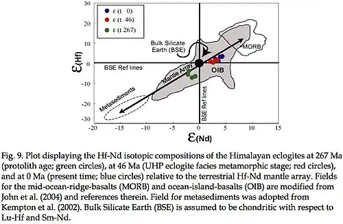 The original figure 9 from Rehman et al. (2012) showed an intermedia, mixed ɛHf trend for the eclogites that was studied. The experimental result indicate that the eclogites were formed from ocean-island basalt with contamination from sediments to produce the intermediate ɛHf values.[11]