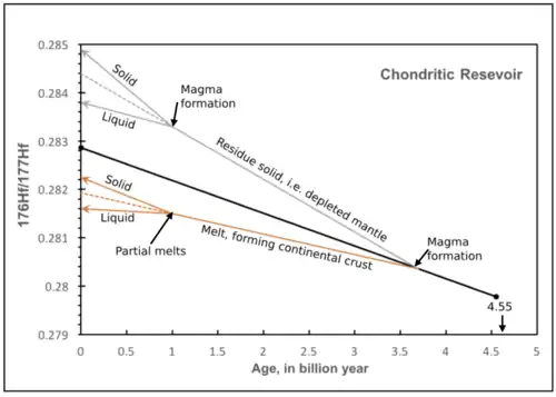 The chondritic uniform reservoir model age is the age at which the material, from which rock and mineral forms, leaves the chondritic uniform reservoir, i.e. the mantle, when assuming the silicate earth retained chemical signature of chondritic uniform reservoir.[4] As described in previous section, melting will cause a fractionation of Lu and Hf in the melt and residue solid, thus resulting in Lu/Hf and Hf/Hf values deviating from chondritic uniform reservoir values.[3] The time or age at which the Lu/Hf and Hf/Hf values from the sample and chondritic uniform reservoir matches is the chondritic uniform reservoir model age.[3][4]