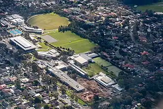 Aerial view of Luther College, building works in view.