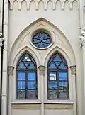 During the restoration process and later, the building was decorated with stained glass, which were initially missing, since in the 19th century the parish of St. Michael's Church was one of the poorest in the St. Petersburg and could not afford stained glass.[5]