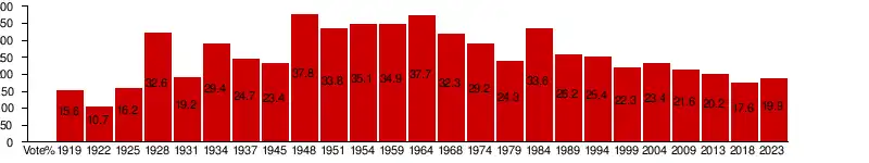 The party was reformed after the Second World War as the 'Luxembourg Socialist Workers' Party', in the mould of the Labour Party in the United Kingdom,[13] where the government had been exiled. In the first election after the war, in 1945, the LSAP was the big loser, falling to 26% of the vote, but remained in the National Union Government, along with all other parties.[13] In 1947, the party started its process of re-building itself, and it managed to join a coalition government (1951–1959 in the Dupong-Bodson and Bech Bodson governments, and 1964–1968 in the Werner-Cravatte government). The discussions over the party's direction split the LSAP again. On 2 May 1970, Henry Cravatte was ejected as President by a trades union-led coup. In March 1971, centrist elements, led by Cravatte, split to create the Social Democratic Party.[14] Those who left included 6 Deputies and most of the party leadership.