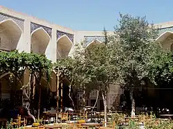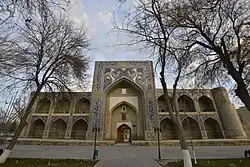 The madrasa is the oldest building of the ensemble. It has 160 cells, located in two stores on the perimeter of a two iwans yard. The traditional facades of the madrasah are adorned with majolica.[2] Over its history, the madrasa performed many different roles: it served as a caravanserai and defensive fortress, and even as a place of execution. Today a section of the madrasa is a museum dedicated to the writers Sadriddin Ayni and Jalol Ikromiy.[3]