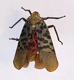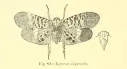 Adult L. imperialis measure between 16 millimetres (0.63 in) to 21 millimetres (0.83 in) in length. Distant described the general morphology of L. imperialis as similar to the subfamily Aphaeninae, with similarities in the proboscis, upward facing, narrow face, a ridge-like prothorax, and overall wing structure. The head and thorax range from a light brownish yellow to an olive color. L. imperialis' abdomen is yellowish on the lateral sides with black and white bands separating the abdominal segments present on the top and bottom.[6] The basal two thirds of the forewings are a bluish-green and covered in approximately 25 rounded black spots. The apical third of the forewings is translucent with bright bluish-green color and lacks black spots.[7] The sternum, legs, and rostrum are a chestnut color.[6] The hindwings of L. imperialis range from a crimson color with 8 spots to a purple color with blue bands.[6][8] The tips of the forewings are black. When the forewings are spread, L. imperialis measures up to 2.5 inches.[7] The orange antennae attach below the eyes and are bulbous with thick bristles covering the outer segments.[9] L. imperialis, along with some related planthoppers, is colloquially referred to as "lanternfly" or "lantern bug", as some of the related genera (e.g., Pyrops) have unusual heads with brightly colored tips that were once thought to emit light.[10] However, no planthoppers emit light.[11][12]