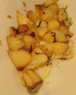 August Escoffier (1907) recommends frying the potatoes and the onions separately in butter before combining them and sprinkling them with chopped parsley.[4] Marcel Boulestin's recipe (1931) adds the onion raw to the pan in which the potatoes are frying.[5] Elizabeth David (1970) specifies frying the onions first and adding them to the frying potatoes when the latter are very nearly cooked. She recommends either butter or beef dripping for frying both ingredients, and comments that the dish cooked in this way "bears little resemblance ... to the greasy mixture of unevenly browned potatoes and frizzled onions which usually passes for pommes lyonnaises".[6]