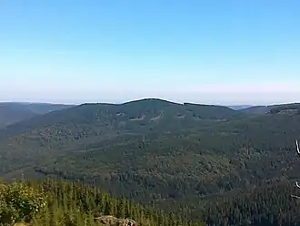 The main summit of Lyra has no marked tourist trail leading to it.[3] However, a main path runs through the summit area, traversing a nearly flat ridge through a forest clearing.[6] The summit itself is located on a rock formation about 125 metres long,[8] surrounded by spruce forest[5] and covered with a very common plant found throughout the Hrubý Jeseník area, namely European blueberry.[9] The summit rock formation serves as a viewpoint offering vistas of mountains such as Praděd,[10] Vysoká hole, Petrovy kameny, and Žárový vrch.[3]