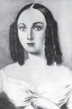 Lyubov Ivanovna Mlotkovskaya (Russian: Любовь Ивановна Млотковская; 1804–1866) was a Russian stage actor. She was engaged in a number of provincial theatres and travelling theatres in 1823–1866, most notably the Kharkov theatre, and played an considerable part in Russian theatre life during the first half of the 19th century. She has been referred to as the most popular actress of the provincial theatre in the 1830s and as the greatest actress of the provincial theatre of her time. She is most known for her role as Ophelia, which she famously created in Kiev and Kharkov 1838–1842, but she was also known to favor and benefit the works of Shchepkin and Mochalov at the Russian stage.