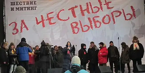 Because Ulitskaya addresses both religion and politics in her work, she has moved to the forefront of the Russian political debate in recent decades. In 2011 and 2012, during the height of the anti-Putin protests in Russia, she became a board member for the League of Voters. She was also considered a traitor by the administration and was the subject of negative statements in state-owned outlets, such as Isvestia.[4] She is firmly anti-Putin; at a press conference for her book The Big Green Tent (Зелёный шатёр, 2010), she remarked that the country was becoming "Stalinized," something that gave her "a whiff of fear."[5]
