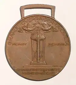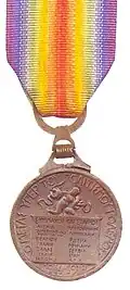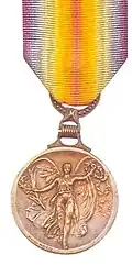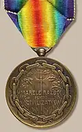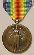 The 1914–1918 Inter-Allied Victory medal (French: "Médaille Interalliée de la Victoire 1914–1918") was a French commemorative medal established on 20 July 1922. It was the French version of a common allied campaign medal where each allied nation issued a Victory Medal to their own nationals, all issues having certain common features, including the same ribbon, a winged figure of victory on the obverse and a similar inscription on the reverse, the French version reading "LA GRANDE GVERRE POUR LA CIVILISATION 1914-1918".