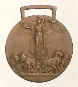 In response to a proposal first made by the French Marshal Ferdinand Foch, supreme commander of the Allied Forces during the First World War, most allied nations issued a Victory Medal following a common design, thereby avoiding any need for countries to exchange campaign medals.[3] Each country produced their own version, following certain common criteria. The medal was to be in bronze with a 36 mm diameter, having a winged figure of victory on the obverse, a common inscription on the reverse and suspension by a double rainbow design ribbon.[4] Japan and Siam replaced the figure of victory, since a winged victory symbol was not culturally relevant.[5]