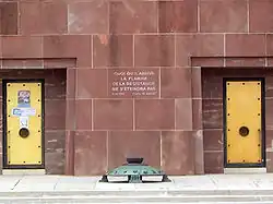 The monument consists of a wall of pink sandstone from the Vosges 150 metres (490 ft) long, on which are mounted sixteen bronze hauts-reliefs depicting, in allegorical form, different types of heroic combat. A Cross of Lorraine 12 metres (39 ft) high stands in the center, in front of which the permanent flame of the resistance burns on a bronze structure.[2] The cross is essentially a Gaullist symbol.[7] There are two bronze doors under the cross. One leads to the burial crypt, carved into the rock. The other gives access to the stairway that leads to the remembrance path.[2] At the base of the Cross of Lorraine an inscription gives part of de Gaulle's speech of 18 June 1940: "Quoiqu'il arrive la flamme de la résistance ne s'éteindre pas" ("Whatever happens, the flame of the resistance will not be extinguished.")