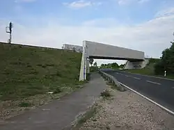 For this purpose, a new line was built that included a single-track overpass over federal highway 264 and the single-track, 285 m long Ulhaus tunnel[2] under the Langerwehe arterial road, which ends immediately before Langerwehe station. Its official opening was on 10 June 2009 and operations started on 14 June 2009.