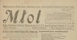 During its first issues, Młot was an organ of the Social Democracy of the Kingdom of Poland and Lithuania (SDKPiL).[5] On 30 December 1918 Młot became an organ of the Communist Workers Party of Poland (KPRP) in Russia.[5] On 23 February 1919 the newspaper became a joint organ of the Central Executive Committee of KPRP and the Central Committee of the Communist Party of Lithuania and Belorussia.[5] On 9 March 1921 the newspaper became the organ of the Polish Bureau of the Central Bureau of the Communist Party (Bolshevik) of Belorussia.[5] In February 1924 Młot became the organ of the Polish Bureau of the Provisional Belorussian Bureau of the Central Committee of the Russian Communist Party (Bolshevik).[5] Between 3 April 1924 and 17 May 1924, Młot was an organ of the Provisional Belorussian Bureau of the Central Committee of the Russian Communist Party (Bolshevik).[5]