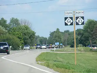 Past the town, M-54 turns due north on Clio Road before crossing into southern Saginaw County. Over the county line, the name changes to Gera Road, and the trunkline runs through farm fields to an intersection with Birch Run Road. At that intersection, M-54 northbound turns westward and joins M-83 to run concurrently to Birch Run while M-83 continues north to Frankenmuth on Gera Road. Birch Run Road carries opposing directions of the two highways, a phenomenon called a wrong-way concurrency. Running westward, the road is signed as both M-54 northbound or M-83 southbound. About two miles (3.2 km) west of the intersection between Gera and Birch Run roads, the two highways meet a common terminus at exit 136 on I-75/US 23 in a commercial district that includes a large outlet mall bordering that freeway.[4][8]