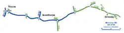 The M180 is a 25.5-mile-long (41 km) motorway in eastern England, starting at junction 5 on the M18 motorway in Hatfield, within the Metropolitan Borough of Doncaster, South Yorkshire, and terminating at Barnetby, Lincolnshire, some 10 miles (16 km) from the port of Immingham and 14 miles (23 km) from the port of Grimsby. The A180 road continues to the east for Grimsby, Cleethorpes and Immingham. Scunthorpe, Lincoln, Hull (via the Humber Bridge), Brigg, Bawtry and the Isle of Axholme can be accessed using the motorway. Humberside Airport, the now-closed Doncaster Sheffield Airport, and the Killingholme, Humber and Lindsey oil refineries are close to the motorway. The road forms part of the unsigned Euroroute E22 and is the main route along the south bank of the Humber Estuary.