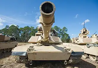 ![]() Front view of a M256 gun on an American M1A2 SEP main battle tank during a gunnery exercise at Red Cloud Range, 2013. | |