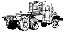 The M748, with the M796 bolster trailer, was used to carry long loads like logs, poles, and bridge sections. The front of the load was secured to a rotating bolster on the truck and the rear of the load was secured to the trailer. The truck and trailer had a tubular boom that connected them under the load. When the truck was unloaded the trailer could be loaded onto the truck. The truck had a large cab protection rack and both front and mid-mounted winches.[4][22]