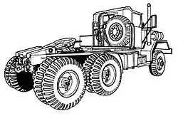 The M39 series had both single- and dual-rear-tire models; very few single-rear-tire trucks were built. Most models had 11.00×20s with dual rear tires; tractor wreckers had larger 12.00×20s. Bridge trucks and all M139 chassis-based trucks had 14.00×20s. [7] A standard military cab, designed by REO, was used. It had hinged doors with roll-up windows, a folding windshield, and a removable canvas roof. A hard roof could be fitted.[3][4][10][11] Cargo trucks and tractors could be fitted with a ring mount for a M2 Browning machine gun.