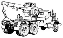 The M62 and 543 were wreckers used to recover disabled or stuck trucks and lift large components. A rotating, telescoping, and elevating hydraulic boom could lift a maximum of 20,000 lb (9,100 kg). The M62 had an Austin Western boom; its replacement, the M543, had one by Garwood. Although the truck was not meant to carry a load, the boom could support 7,000 lb (3,200 kg) when towing. They had 20,000 lb (9,100 kg) front and 45,000 lb (20,000 kg) rear winches, outriggers, boom braces, chocks, block and tackle, oxygen-acetylene torches, and other automotive tools.[7][18]