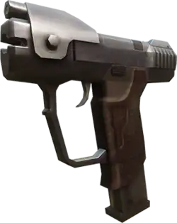Seth Macy of IGN called the M6D Pistol the greatest weapon in Halo history, stating that it was most famous for its "three-shot kills", which would kill an enemy with three shots to the head even when shielded.[5] As "the most-feared weapon" in Combat Evolved as well as "the defining element of Halo LAN parties", the M6D placed ninety second place on IGN's Top 100 Video Game Weapons list.[6] Natalie Clayton of PC Gamer called the pistol "practically legendary", but criticized it for "throwing weapon balance out the window, especially on PC", due to its "deadly-accurate headshots".[7] Luke McKinney described the M6D as the "upgrade to Dirty Harry’s gun plus half a millennium of polishing", and that the pistol's "overwhelmingly effective" utility increases even further when dual-wielded with a plasma pistol.[1] Kotaku consider the M6D pistol one of the best video game handguns, noting that "there’s this split second of lag between firing and hitting that gives it a satisfying crunch that hitscan weapons in other games can’t replicate".[8]