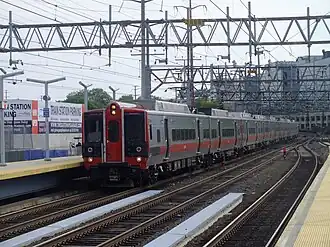 ![]() M8 EMUs on a Metro-North train arriving at Stamford on the New Haven Line. | |