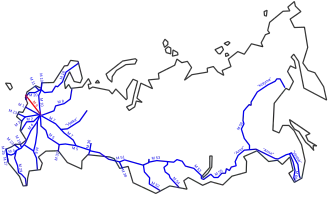 The Russian route M9, also known as the Baltic Highway, is a 610 km-long trunk road that leads from Moscow through Volokolamsk to Russia's border with Latvia. The road runs north of Moscow across the towns of Krasnogorsk, Istra, Volokolamsk, Zubtsov, Rzhev, Velikiye Luki, and Sebezh, ending up at the state border. It passes Moscow, Tver, and Pskov Oblasts. The highway forms a part of the European route E22 which continues across the border to Rēzekne and Riga.[1]