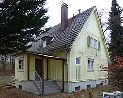 The architectural design resembled conventional stone buildings: The perforated facade with a gable roof and mullioned windows with shutters were "quite plain, but cosy and with all objectivity something for the German mind" as required in the specification by the architect Hans Schneider on behalf of MAN in 1949.[3] The basic type could be ordered according to the catalogue with different roof pitches. The inner walls could be built individually, since the roof was supported by the outer walls. The version with the steeper roof provided space for a habitable attic.[4]