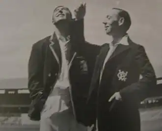The MCC touring team left Tilbury Docks on the S.S. Stratheden amidst calls to cancel the Ashes tour because of the weakness of the team led by Freddie Brown.[2] Such critics were, of course, ignored and the team travelled in first-class luxury on the P&O liner. Though it took several weeks for them to reach Fremantle in Western Australia this method avoided jet lag and allowed the team to relax and get to know each other. The teenager Brian Close had been excused from National Service in the British Army and was particularly active in exploring the whole ship from top to bottom. Apart from the normal deck exercises some of the MCC players formed a short-lived band and Godfrey Evans gave his well-known impression of Carmen Miranda in the fancy dress party. They stopped in Ceylon for a one-day game which was drawn, but saw Arthur Macintyre make 104 and Len Hutton damage one of his fingers. They otherwise arrived safely and found that steak and fried eggs were regularly served in Australian hotels (virtually unobtainable in ration-bound Britain) and soon put on weight.[3][4]