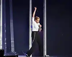 To promote the album, Madonna embarked on the MDNA Tour, which was her ninth concert tour.[10] The tour visited America, Europe and the Middle East, while also marking the singer's first performances in the United Arab Emirates, Ukraine, Scotland and Colombia.[11] Described by her as "the journey of a soul from darkness to light", the MDNA Tour was divided into four sections: Transgression, where guns and violence was the main theme, Prophecy, where a mix of joyful songs that bring people together are performed, Masculine/Feminine, a combination of sensuality and fashion with a few of Madonna's classic songs performed in a French Cabaret-style, and Redemption, which Madonna labelled as "a big party and celebration".[12] The tour received positive reviews,[13][14][15] but courted many controversial subjects such as violence, firearms, human rights, nudity and politics.[16] Nevertheless, it was a commercial success and many venues were instantly sold out.[17] After completion, it was dubbed the highest-grossing tour of 2012 by Billboard. Total gross was $305.2 million from 88 sold-out shows, becoming the tenth highest-grossing tour of all time and surpassing Celine Dion's Taking Chances World Tour as the second highest-grossing tour among female artists, behind Madonna's own Sticky & Sweet Tour.[17]