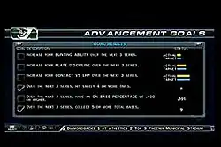 One of the game's main gameplay modes is "Road to the Show" mode. In Road to the Show, the player creates a player to be part of an organization. The player controls only that player through their career, and attempts to make them better by earning skill points from achieving goals such as getting hits, stealing bases, or turning double plays.[4] The career player begins playing in the minor leagues at AA class, and progresses through AAA class until they are called up to the Major Leagues.[4] The player must accomplish goals that are given to them by their team manager, which in turn give then skill points if they are completed, and deduct skill points if they are failed or not attempted.[4] There are also "advancement goals" that the player must accomplish over a certain period of time that will help the player's career player advance to higher levels of play. Advancement goals include developing abilities, getting higher stats, and getting on base more often.[4]