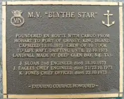A memorial plaque, dedicated to Blythe Star at the Tasmanian Seafarers' Memorial at Triabunna, is on the east coast of Tasmania, approximately 50 kilometres (31 mi) north of where the surviving crew made landfall at Deep Glen Bay.[1][19] The text of the plaque honours the dead sailors (as per the image above).