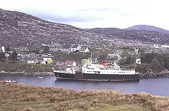 Hebrides' new Uig-Tarbert-Lochmaddy service opened up car travel to the Western Isles.[1] From 1964, she spent over twenty years on the route. On her introduction, the old Outer Isles mail steamer Lochmor ceased her crossings of the Minch, instead taking up the Armadale service from Mallaig, until the second new car ferry arrived.