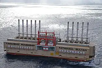 Converted into a power barge by Sedef Shipyard in Tuzla, Istanbul in 2013, she was renamed Fatmagül Sultan after the sister of Karadeniz Holding's chairperson.[4] Equipped with eleven electric generators,[6] four high-voltage transformers and operated by a crew of sixty technicians and engineers, the Powership has an installed generation capacity of 202 MW on dual-fuel (HFO- and gas-fired).[7] The Powership's fuel tanks capacity allows her to generate ten days long uninterrupted power.[5][8]