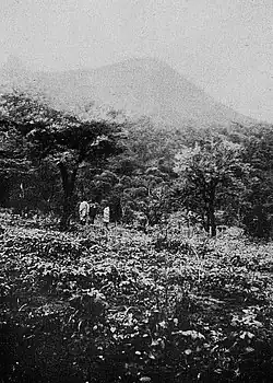 In the 1920s, the mountains were thickly covered with trees.[7] The flora includes box (Buxus hildebrandtii) and acacias, as well as groves of the Bankoualé palm (Livistona carinensis) in ravines. Higher elevations of 1,300–1,600 metres (4,300–5,200 ft) are home to African juniper (Juniperus procera) forest that include tall arborescent Euphorbia, and flowering herbs such as forget-me-not. Near the summit can be found ferns.[18][17]