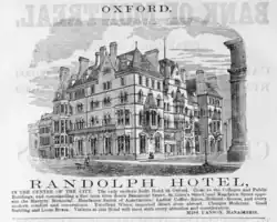 Construction of the Randolph Hotel began in 1864, to a design by William Wilkinson,[1][2] an architect who also designed many houses in North Oxford.[3] There was debate about the building's design. John Ruskin favoured Gothic Revival like the nearby Martyrs' Memorial. The City Council wanted a classical style since the rest the buildings in Beaumont Street were early 19th century Regency. A compromise was attained with a simplified Gothic façade, similar to the Oxford University Museum and the Oxford Union buildings, but in brick.