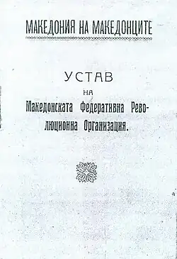 Under the "Macedonia for the Macedonians" slogan IMARO expressed resentment felt against the irredentist aspirations over Macedonia as much as toward the Ottoman rule, and anticipated that it would restrain the region's partition by the warring Balkan states.[21] Thus, in order to enforce the idea of autonomy,[22] IMARO changed its exclusively Bulgarian character,[23] and opened it to all Macedonians and Thracians regardless of nationality, who wished to participate in the anti-Ottoman movement.[24] In an article published in June 1902, the IMARO revolutionaries promoted the idea of autonomy and the slogans "Macedonia for the Macedonians".[25] The Organization gave a guarantee for the preservation of all national communities there, and insisted that the Bulgarians could be proud of their tolerance, in opposition to Romanians, Serbs and Greeks. They also planned that the administration of the future autonomous Macedonia will rely on the Bulgarian majority. Those revolutionaries saw the future autonomous Macedonia as a multinational polity, and "Macedonian" was an umbrella term covering Greeks, Bulgarians, Turks, Aromanians and Megleno-Romanians, Albanians, Serbs, etc.[26] However, there was no clear concept about the ultimate outcome of the autonomy, some of the members, especially those with leftist inclination, saw it as independent Macedonia, while others saw it as step for the incorporation of Macedonia into the Bulgarian state.[27][28][29][30] The British Consul in Skopje Raphael Fontana wrote on the occasion of the Ilinden Uprising in 1903 that the revolutionaries were working for a general Bulgarian uprising in order to reach their goal of "Macedonia for the Macedonians", understood to mean "Macedonia for the Bulgarians".[31]